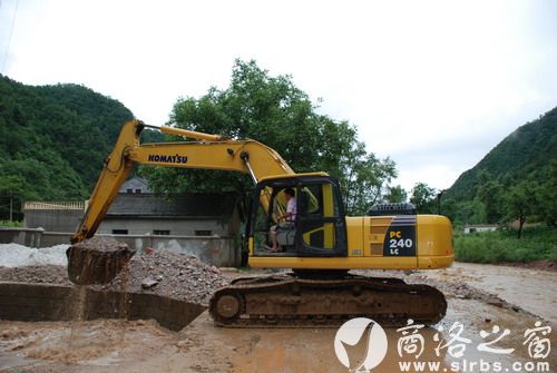 鏟車在石門鎮石撞溝口橋上作業,疏通渠道內洪水涌來的泥沙。
