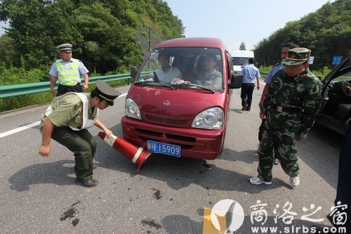 本網訊(記者 方 立 攝) 7月26日上午10時10分,商南“7·24”特大水災造成縣城西郊一段高速公路懸空,公安干警、武警官兵緊急搶險。一輛車號陜H-15909小面包車,違章強闖安全警戒區,輾壓多個警戒隔離墩。大災官兵搶險,小車冒險搶道,好險、好牛!