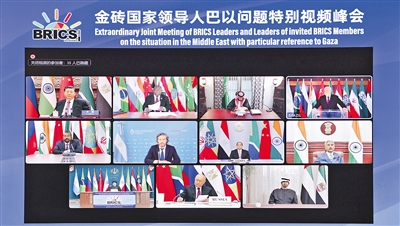 ■本次峰會是金磚擴(kuò)員后的首場領(lǐng)導(dǎo)人會晤。當(dāng)前形勢下,金磚國家就巴以問題發(fā)出正義之聲、和平之聲,非常及時、非常必要。加沙地區(qū)的沖突已持續(xù)一個多月,造成大量平民傷亡和人道主義災(zāi)難,并出現(xiàn)擴(kuò)大外溢趨勢,中方深表關(guān)切。當(dāng)務(wù)之急,一是沖突各方要立即?;鹬箲?zhàn),停止一切針對平民的暴力和襲擊,釋放被扣押平民,避免更為嚴(yán)重的生靈涂炭。二是要保障人道主義救援通道安全暢通,向加沙民眾提供更多人道主義援助,停止強(qiáng)制遷移、斷水?dāng)嚯姅嘤偷柔槍由趁癖姷募w懲罰。三是國際社會要拿出實(shí)際舉措,防止沖突擴(kuò)大、影響整個中東地區(qū)穩(wěn)定。各方應(yīng)該將聯(lián)合國大會和安理會有關(guān)決議要求落到實(shí)處