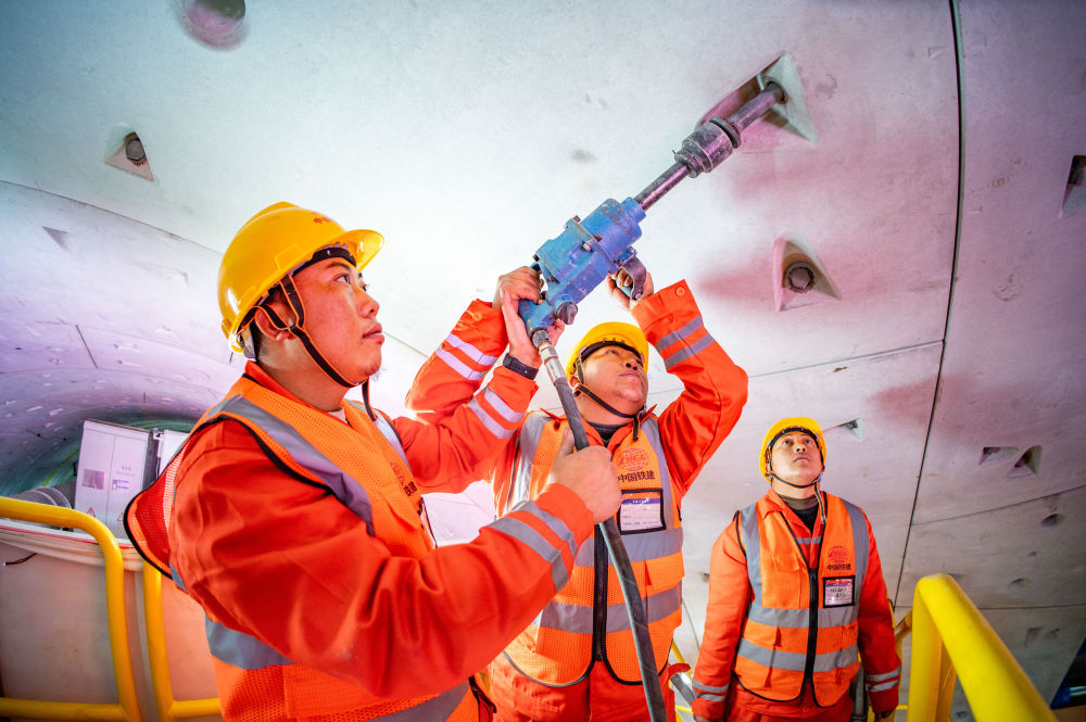 在中鐵十四局京唐城際鐵路運潮減河隧道內,施工人員在拼裝管片(2024年2月4日攝)。新華社發(中鐵十四局供圖)