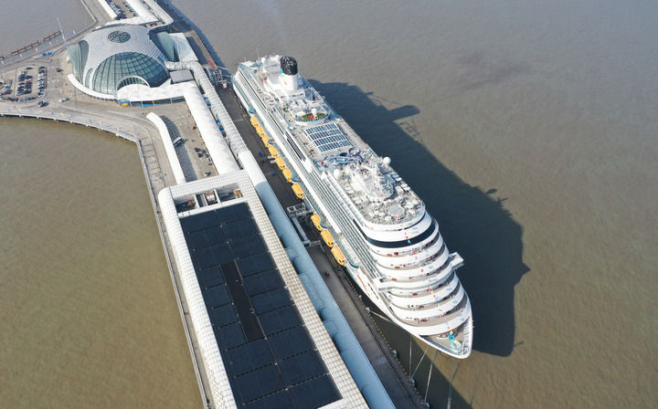 2024年1月1日,“愛達·魔都號”停靠在上海吳淞口國際郵輪港(無人機照片)。新華社記者 丁汀 攝