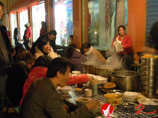 三四口大鐵鍋,五六條長板凳夾一個矮桌子,一對對男女老少擠坐在矮桌兩旁,呼呼抱著個碗喝個不停,人們喝著小紅豆伴著玉米面慢慢熬成的粥,讓旁觀者也讒言欲滴。精于做小吃生意的主人,不像豪華酒店和時尚酒吧門前的迎賓小姐那般光鮮照人,他們目不斜視,專心致志做手上的活。那些腰系圍布,衣著整潔,動作利索的大叔或大姐,操著商洛本地特色方言: "--來一碗吧!"語辭之中,絕無強人所難之意,但實在不忍心挪步。于是,坐下來,"給我來一碗糊湯…--",案板上,放著小菜,酸菜,拌蘿卜絲,辣椒,任你選,由你加。一塊五毛錢,會讓你覺得囔中之物,恰到好處,喝完會有十分的滿足感。