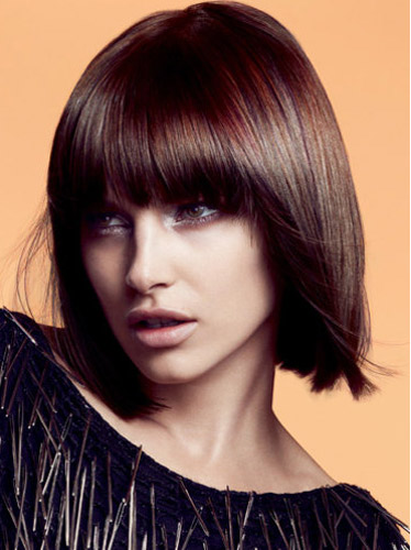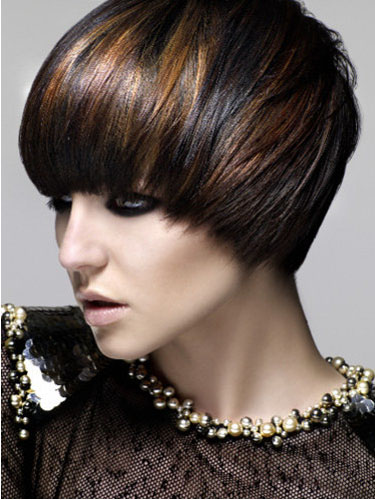 淺亞麻色屬于冷色調,為了防止頭發顯得干枯,可以挑染含有光澤度的顏色,同時,明暗的對比使整體發色更加富有立體感。在基礎色上加入高光色進行挑染。為打造厚重感的A字形效果,頭發表面要加入些層次,發尾做平卷。兩側弧線形狀保持了女人味。