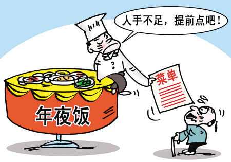 據錦都酒店的餐飲部工作人員說,今年的訂餐從2010年12月初就開始了,他們準備了六七十桌,元月中旬就已經訂滿。為了解決餐位緊張的情況,各大飯店紛紛采取了分時段預訂年夜飯的措施。
