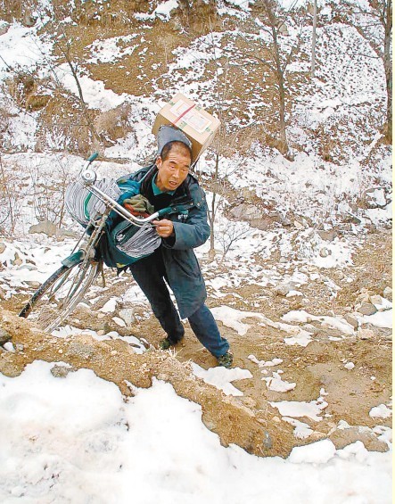 在老田所走的路上,除了一般的山路外,石道峪嶺和鳳凰嶺是他每次必須翻越的兩大山嶺,盡管現在通村水泥路能一直通到山頂,但由于坡度太大加之路程太長,老田每次都是扛著自行車走小路。“盤山路彎太大,走小路比較近,雖然累但能省時間,村民也能更早地拿到東西。”老田告訴記者,由于家庭經濟差,上世紀90年代初期他應聘當了一名鄉村郵遞員,至今已經19年了。目前,他的兒子和女兒都上了大學,這一點讓他很欣慰。“天氣好的話走山路還好些,但幾天前剛下過雪,路就比較難走。”上石道峪嶺時,老田提前給自己腳上綁上了防滑的鐵扣子,然后把自行車扛在肩膀上開始翻山……