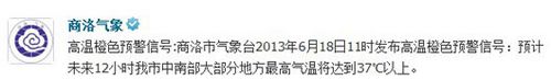 商洛日?qǐng)?bào)訊 高溫橙色預(yù)警信號(hào):商洛市氣象臺(tái)2013年6月18日11時(shí)發(fā)布高溫橙色預(yù)警信號(hào):預(yù)計(jì)未來12小時(shí)我市中南部大部分地方最高氣溫將達(dá)到37℃以上。(商洛氣象)