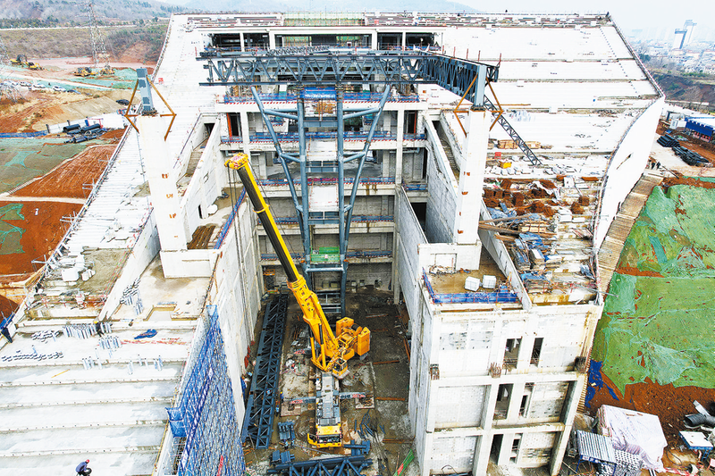 工人正在吊裝巨型鋼構(gòu)裝置