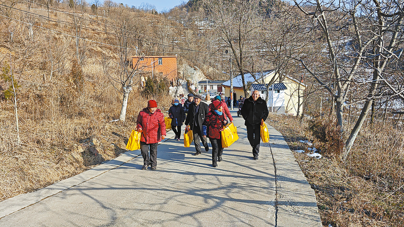 1月29日,山陽縣十里鋪街道磨溝里村的老人們喜氣洋洋地帶著溫暖包回家。