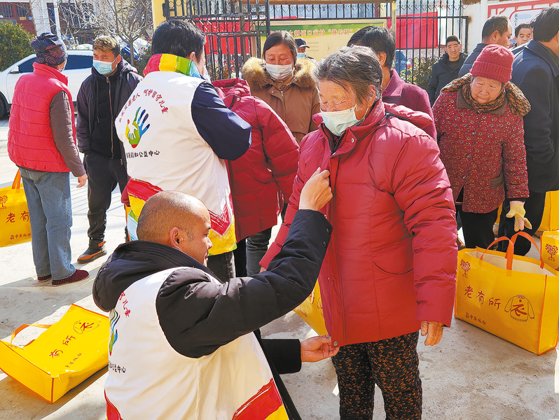 1月21日,洛南縣景村鎮常灣村、景豐村的100多名老人收到了志愿者們送來的“老有所衣”溫暖包。已經81歲的周小粉老人穿上羽絨服后,拉住志愿者的手感激地說:“這衣服好得很,還有一大包東西,我心里很高興,謝謝你們!”