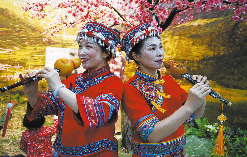 如水的月光下,如霧的竹林里,合唱團演出的《月光下的鳳尾竹》輕柔舒緩,動人心弦,令觀眾沉醉其中。據(jù)領(lǐng)隊王玉燕介紹,王菊霞今年69歲,是合唱團年紀最大的成員。“我4年前跟大家一起吹葫蘆絲,一開始我們經(jīng)常在公園學習、練習,到了第3年,陸續(xù)有人邀請我們演出,能結(jié)緣葫蘆絲,認識這些朋友,我很榮幸!”王菊霞說。金樂山今年61歲,是一名轉(zhuǎn)業(yè)軍人,他告訴記者,他年輕時就有一個音樂夢,只是忙于工作和家庭,暫時擱置了。現(xiàn)在他已經(jīng)退休,有充足的時間,兩年前看到朋友在吹葫蘆絲,他很高興地加入了合唱團。“吹了葫蘆絲,新朋友多了,精神頭好了,煩惱、痛苦都少了。”金樂山高興地說。