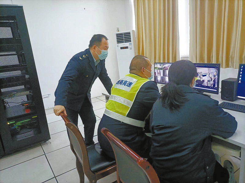 2月15日,腰市收費站副站長陳鑫(左一)正通過監控系統認真分析站區車輛通行情況。