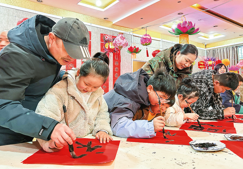③2月21日,在市文化館舉辦的”非遺過大年”活動現場,工作人員和家長指導小朋友寫春聯。(本報記者 王 倩 攝)
