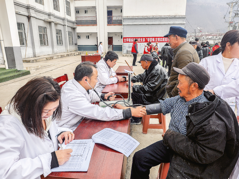 △3月5日,鎮安縣大坪鎮新時代文明實踐所組織機關支部黨員、衛生院醫護人員等40多人走進大坪鎮敬老院開展“文明栗鄉·志愿同行”志愿服務活動,為老人免費發放藥品100多盒,同時開展義診、內務整理、理發、觀影等活動,全面提升老人的獲得感、幸福感。 (本報見習記者 楊若陽 攝)