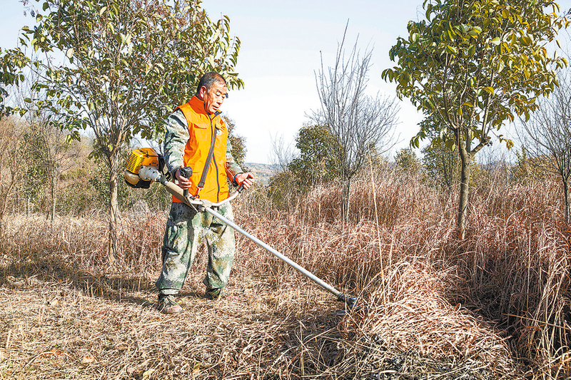 桃園森林資源管護站生態(tài)護林員使用割草機進行除草。當前正值森林防火關鍵期,林場各管護站對轄區(qū)雜草全面清理,并在進山口和人口密集區(qū)設立森林防火巡查崗。