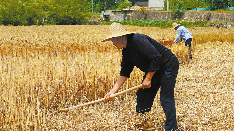 鎮安縣米糧鎮光明村村民利用晴好天氣收割小麥 (本報通訊員 李立彬 攝)