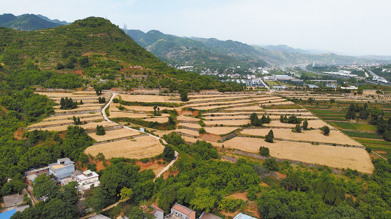 5月31日,丹鳳縣棣花鎮兩嶺社區馬鞍嶺小麥種植基地里,收割機來回穿梭,正在收割。