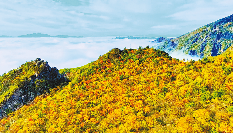 在鎮安的木王山,陽光照耀下的山間樹葉呈現出金黃與火紅的斑斕色彩,宛如整個山林在訴說著秋天的故事。當你登上塔云山頂,斜陽的余暉中,你會目睹如火焰般絢爛的紅葉,體驗黃昏時刻那迷人的秋色。而清晨的松海云霧,也是這場秋日盛宴中不容錯過的美景。