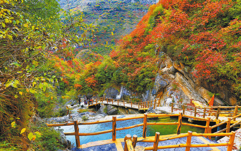 在洛南溪樂谷景區,漫步在山野之間,山水相依,紅葉在枝頭翩翩起舞,是與自然親密接觸的理想之地。
