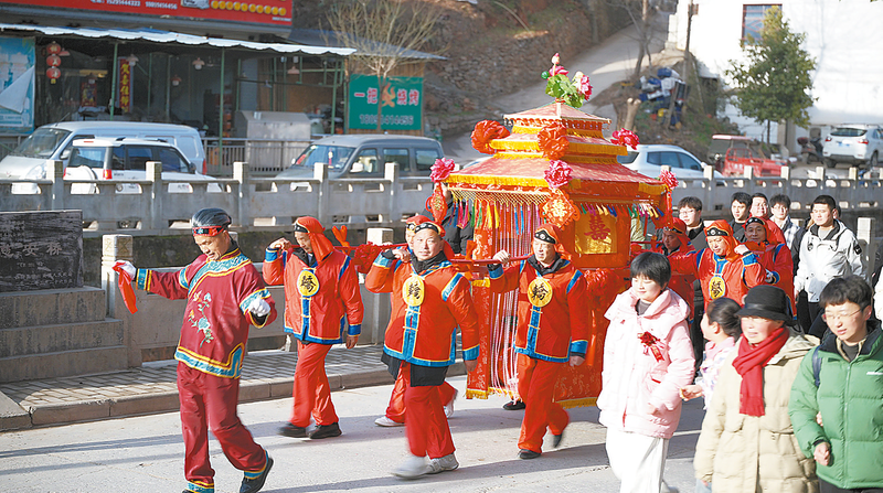 2月3日,山陽縣漫川關(guān)鎮(zhèn)一對(duì)新人舉行傳統(tǒng)婚禮,新郎用八抬大轎迎娶新娘。