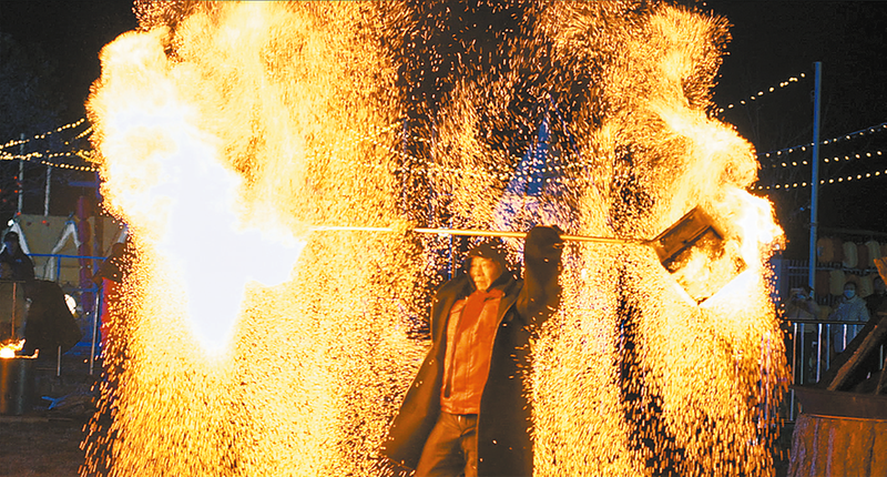 1月30日,丹鳳縣棣花古鎮(zhèn)景區(qū),民間藝人在進(jìn)行非遺火壺表演。