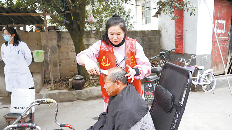 △2月28日,鎮安縣老齡事業服務中心聯合永樂街道青槐社區、新城中西醫結合醫院共同開展“銀齡行動”志愿服務活動,為老人理發、打掃室內外衛生、整理生活物品,并開展健康體檢及評估工作。 (本報通訊員 夏澤梅 攝)