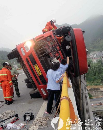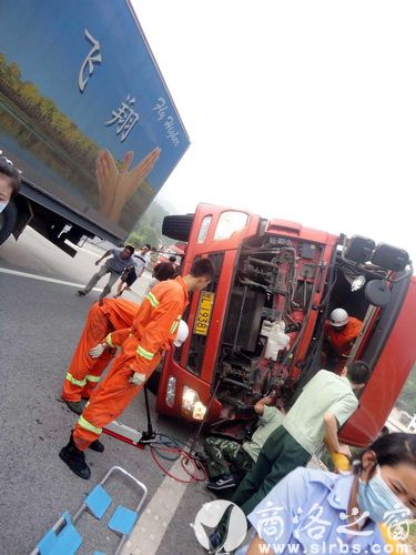據正在搶救現場的商州消防中隊指導員劉欣介紹,貨車是在下立交橋時速度太快,直接翻車的。當時車內共兩個人,一人被夾在駕駛室內,出不來,受傷嚴重,情況危急。他們是6點41分接到報警的。帶隊立即趕到了現場。