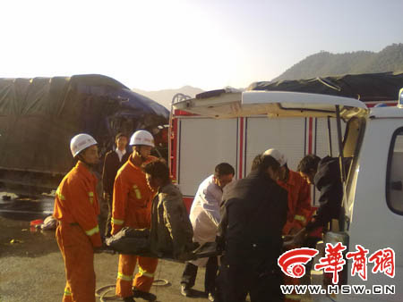 事故地點(diǎn)處于滬陜高速上方向金嶺隧道出口+200米處,一輛車牌號為陜E69381駛向西安的中型貨車,由于司機(jī)疲勞駕駛,加之車速過快,剎車不及追尾撞向同是駛向西安的掛車牌號為豫L811掛的大型貨車,事故車輛停于高速路中央,駕駛室嚴(yán)重變形,2人被困于駕駛室內(nèi),其中副駕位被困情況較嚴(yán)重,情緒非常急躁,不時(shí)發(fā)出凄涼的呼救聲。