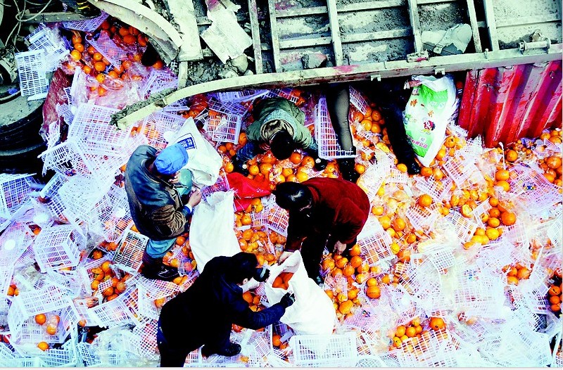 11月16日凌晨5時許,一輛江西牌照的半掛大貨車不慎翻入十多米深的河道內,車內兩人受傷,30多噸水果散落在河道中。傷者被急救人員送往醫院后,藍田縣葛牌鎮鐵索橋村部分村民及附近多個村子共40多人,沖入事故現場,開始哄搶水果,有些人甚至開來面包車、農用三輪車、摩托車往家里轉運水果。直到12時18分,草坪派出所民警趕到現場才將鬧劇制止,但現場的水果最多剩下不到三分之一了。