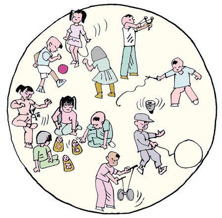 這一階段,兒童游戲按類別可分為以下幾種,球毽類如:足球、手球、彩球、繡球、拍皮球、踢毽子等。投擲類有:彈弓、射箭、抓子兒等。冰水類:打水仗、堆雪人、滑冰車、打陀螺等。生活游戲類:過家家、演劇唱戲、養貓養狗養小雞、捕蟬捕鳥撲蝴蝶、養蟈蟈養蟋蟀。休閑運動類:抖空竹、放風箏、捉迷藏、打秋千、滾鐵環、跳大繩、跳皮筋等。
