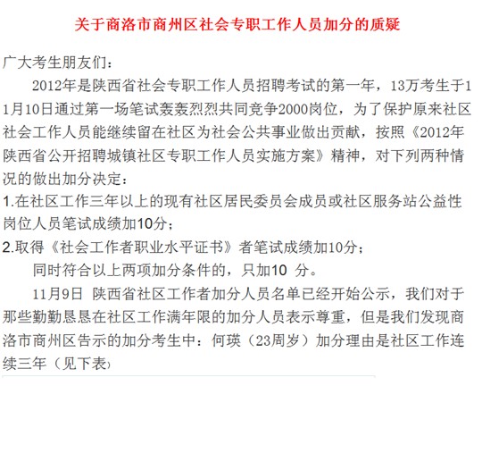 據了解,2012年11月12日,有網友發表了一則關于質疑陜西省商洛市商州區社會專職工作人員加分的帖子。