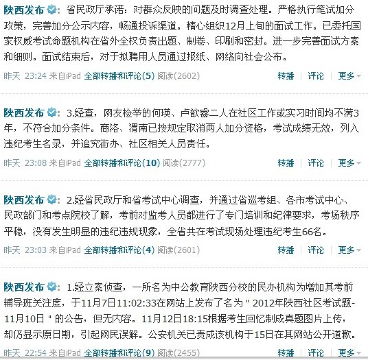 26日23點(diǎn)08分,“陜西發(fā)布”微博稱“經(jīng)查,網(wǎng)友檢舉的何锳、盧馨睿二人在社區(qū)工作或?qū)嵙?xí)時(shí)間均不滿三年,不符合加分條件。商洛、渭南已按規(guī)定取消兩人加分資格,考試成績無效,列入違紀(jì)考生名錄,并追究街辦、社區(qū)相關(guān)人員責(zé)任。”
