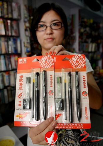 六月六日,在某文具店內(nèi),店主展示熱銷的“考試套裝六件套”。臨近高考,越來越多的商家瞄準“考機”,想盡辦法大打高考牌,與高考相關(guān)的“高考經(jīng)濟”日漸升溫。(李博 攝)