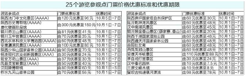 此次確定的門票價格實行優惠的25個景點中,包括7個AAAA級景區,3個AAA級景區,其中陜西歷史博物館唐代壁畫珍品館、銅川藥王山景區、銅川玉華宮景區、陜西佛坪國家級自然保護區、銅川照金香山景區(薛家寨、香山)在國慶7天長假期間門票實行半價優惠。