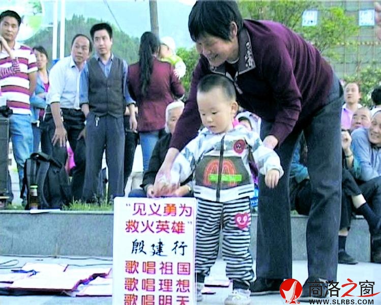 他先后到西安、漢中、南京、杭州等地“游唱”,一場、兩場……,一角、五角、一元……;他一邊走一邊唱,短短幾十天時間,殷建行便將義唱募捐得來的2萬多元全部捐給了地震災區。在四川成都的一次募捐演唱中,有觀眾當場撥打“110”,說他假賣唱騙錢,警察驗看了他的身份證和在不同地點的捐款證明、票據和十幾本證書后深受感動,對他的事跡進行了肯定和表揚。在成都期間,他得知青羊區一個叫沉勇棋的小朋友玩煙花時將全身85%燒傷,家里無力支付醫療費時,經歷過同樣切膚之痛的殷建行當即決定為小勇棋義演募捐。為了早日湊齊手術費,他連續兩個晚上演唱到12點,唱到動情處竟淚流滿面,圍觀的群眾深深地被他感動了,紛紛伸出援助之手。在他的感召下,當地的學校、機關單位紛紛為小勇棋捐款,很快就湊齊了高額的醫療費,小勇棋植皮手術得以順利實施。