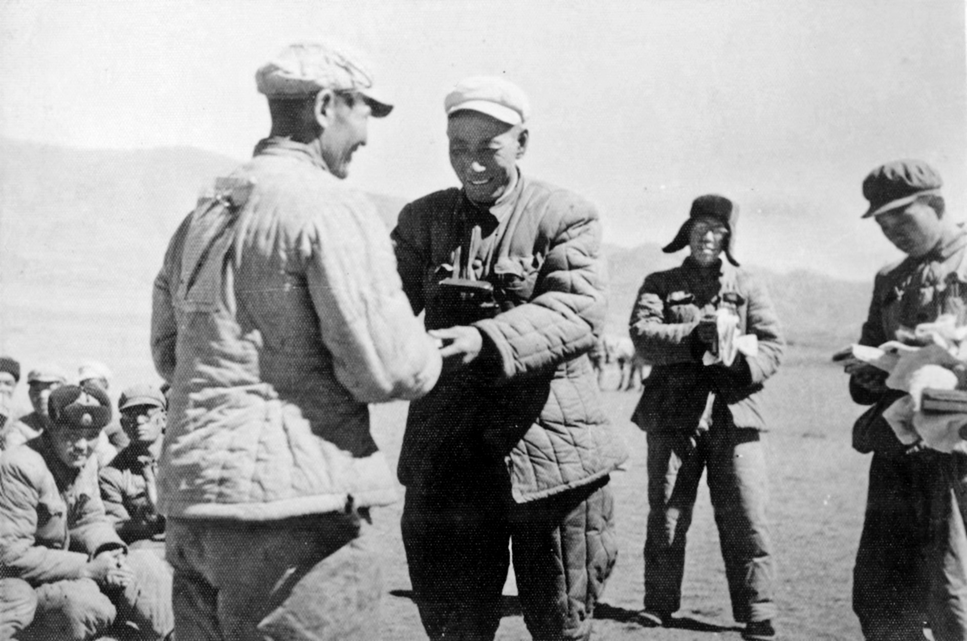 冬蟲夏草是動物和植物的完美結合,具有補肺腎、止咳嗽、益虛損、養精氣的功能,其他滋補品沒有一款能跟它相比,對于副司令員的病來說,真是雪中送炭。戰斗結束回到駐地后,郭增尚到后勤處要了一點大米。部隊的大米和白面,都是從都蘭縣出發時用駱駝馱來的,極其金貴,尤其到了缺糧的時候,只給傷員病號一點點。司令員有病,也喝不上白米稀飯,東西太少,他也不同意搞特殊。牛奶倒是有,但沒有五谷,胃是不高興的。大家都知道,牛奶煮不熟大米,可郭增尚想了一個小辦法:第一天晚上就用水泡上大米,早上熬稀飯時,米已泡爛,牛奶稀飯里再放上一根冬蟲草,食療藥補特別好。其實,說是牛奶稀飯,米粒簡直能數得清。經過王醫生的精心醫治和郭增尚的細心照顧,20多天后,副司令員的身體基本復原。他高高興興地說:“看把你們嚇得,這不是好了嗎?我是屬貓的,命大著呢!”完成剿匪任務后,蘭州軍區給翟萬寶副司令員記三等功。