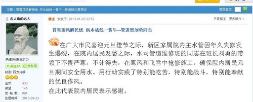 修校表班的職工們不僅以完美履行崗位職責為最高榮譽,還經常為用戶義務維修供水設施,好人好事層出不窮,得到了用戶的一致好評,多次收到了用戶送來的感謝信。用戶"名人街的名人"在1月3日華商網商洛論壇發帖《頂風冒雪解民憂,供水戰線一黃牛》,高度贊揚以劉勇為代表的修校表班職工"不畏嚴寒、不計得失,在寒風和飛雪中搶修施工","用行動實踐了特別能吃苦,特別能戰斗,特別能奉獻的優良作風",充分發揮了黨員的先鋒模范作用和戰斗堡壘作用,供水企業的"旗幟精神" 在他們雖然平凡卻充滿意義的人生中熠熠生輝。