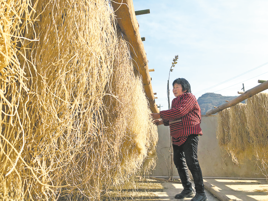 △萬灣社區(qū)充分調(diào)動黨員群眾發(fā)展產(chǎn)業(yè),人均年純收入突破2萬元。圖為萬灣村集體經(jīng)濟(jì)粉條加工廠內(nèi),群眾正在晾曬粉條。