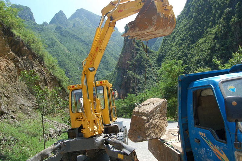 7月19日中午,馬灘道班組織職工正在板巖清除塌方。近日來,山陽縣境內普降大雨,造成縣內十七條道路中斷,其中203省道滑坡數十處。為了保證道路暢通,山陽公路段廣大干部職工堅持分段包干檢查執勤,隨時發現滑坡、塌方,隨時清除。黃石板塌方嚴重,道班集中人力用了一個多小時就在塌方出開通了便道;十里溝口泥石流接連不斷有滑坡的泥石流阻塞交通,公路段專門安排一輛裝載機隨時清通障礙。 攝影 王榮金