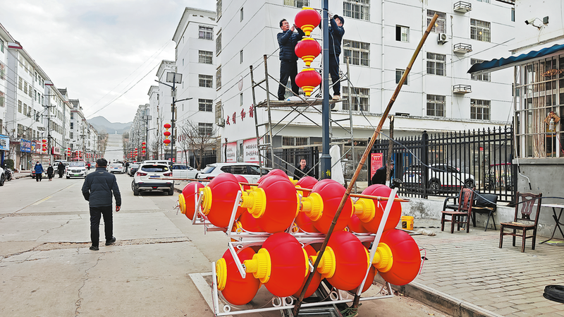 春節即將來臨,為了營造歡樂祥和的節日氛圍,連日來,洛南縣古城鎮在主要街道懸掛燈籠,讓年味更近一點、更濃一些。 (本報記者 楊 鑫 攝)