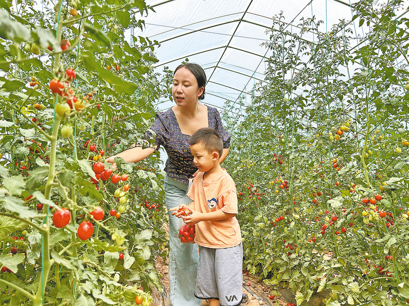 游客在張平的瓜果種植采摘基地采摘圣女果