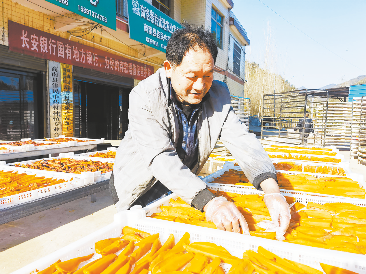 “來來來,過來吃紅薯干哦!”商南縣清油河鎮(zhèn)致富帶頭人李青華一邊擺放切好的紅薯干,一邊招呼著過往熟人。