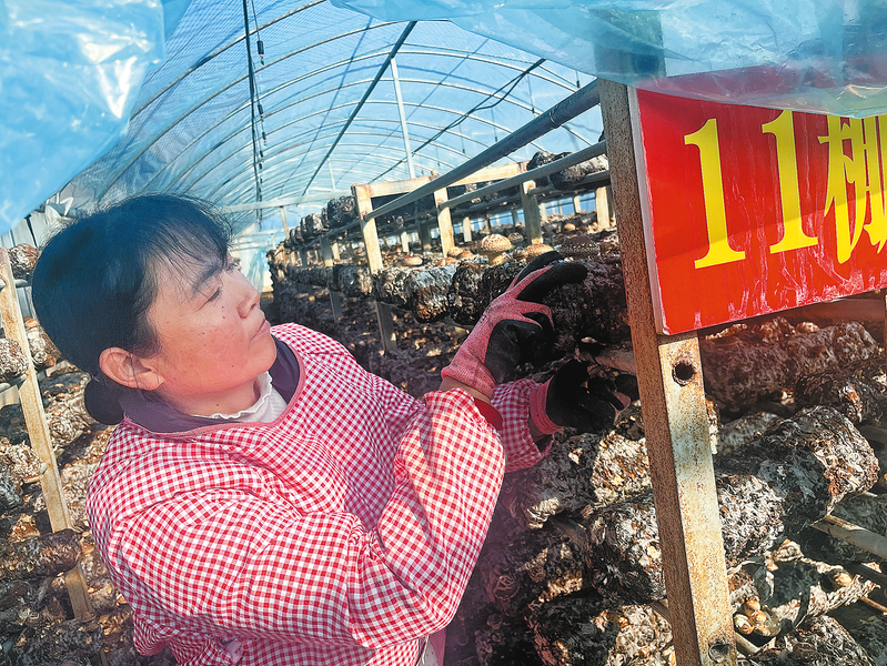 1月4日,商南縣金絲峽鎮(zhèn)二郎廟村村民李江粉正在大棚里采摘香菇。據(jù)了解,當(dāng)前全村種植香菇63萬袋,帶動43戶村民年均增收3000元。 (本報記者 南 璽 攝)
