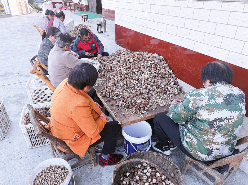 11月19日,村民正在加工(剪菌柄)、分揀剛采收回來的香菇。