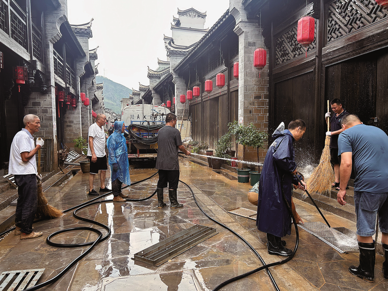 10日凌晨4時,縣城管局抽調30多人,帶著大型抽水泵,開著灑水車、吸污清洗車等趕赴漫川關。“作業的難點一是沒有施工圖,對地下排水管網分布不清楚,二是為了保護古街地面的花紋、地磚,只能動用小型鏟車,通過手工探摸井蓋,開展淤泥雜物清理和地下排水管網疏通。”縣城管局局長楊昌說,目前,他們已對全鎮污水管網和污水處理廠受損管網進行統計,并加急維修。