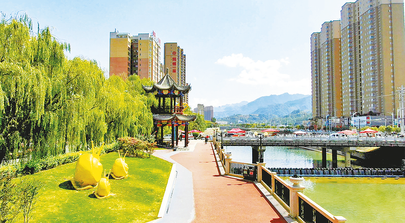 在山陽縣城濱河公園,碧水藍天與現代城市構成美麗畫卷。