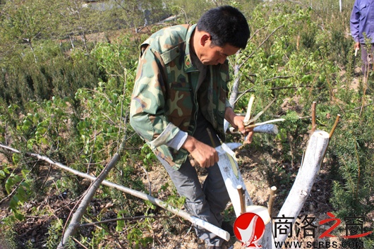 本網訊 (宋奇瑞) 4月25日下午,在柞水縣干佑鎮梨園村陽坡上坪地里,看到一個男子正用油鋸把一棵小核桃樹攔腰鋸斷,走近一看原來是這里正在進行核桃采穗圃嫁接。只見挑選接穗的、削砧木的、插接穗的、包薄膜的、綁扎的,還有兩位婦女正在給接口包報紙、套塑料袋……在午后炎熱的太陽底下,二十幾個人一片緊張熱鬧的忙碌景象,只見身后上百畝小核桃樹都被“改頭換面”,成了縱橫成行的半腰高的“紅樁”。