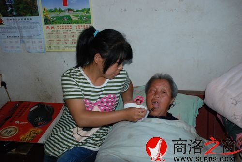 6月22日下午,天下著小雨,筆者來到了位于洛南縣永豐鎮楊村一組的張妮家。我們看到祖孫二人住在一座有些陳舊的三間土房內,院落雖然有些破舊,屋內也沒有一件像樣的家具,但卻打掃的干干凈凈,室內物品也擺放的井井有條,鍋臺簡單潔凈。在東側一間光線有點昏暗的房間土炕上,我們看到,張妮正側坐在土炕邊沿給臥病在床的奶奶霍琴娃一勺一勺地喂著米粥,還不時地用毛巾幫奶奶擦著嘴角。