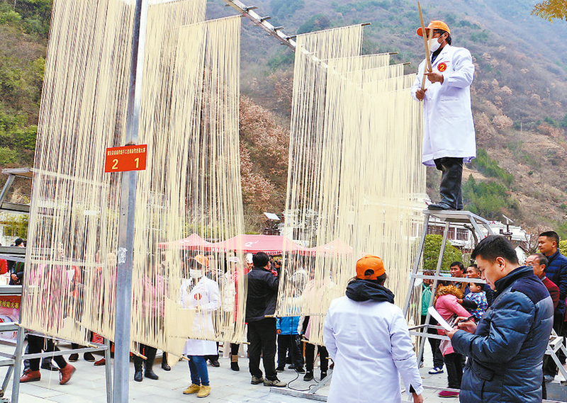 鎮(zhèn)安縣秦綠食品有限公司經(jīng)理余之超在做大做強木耳產(chǎn)業(yè)的同時,于2018年成立了云蓋寺鎮(zhèn)手工掛面產(chǎn)業(yè)協(xié)會,聘請云蓋寺鎮(zhèn)手工掛面技藝傳承人,發(fā)展手工掛面產(chǎn)業(yè)。“云蓋寺鎮(zhèn)手工掛面口感筋道、營養(yǎng)豐富,是饋贈親朋好友的佳品。目前,我們云蓋寺鎮(zhèn)手工掛面主要銷往西安、重慶、上海、蘭州等城市。”余之超介紹,2020年8月,由她牽頭制定的陜西省地方標(biāo)準(zhǔn)DB61/T1374-2020地理標(biāo)志產(chǎn)品——云蓋寺手工掛面被陜西省市場監(jiān)督管理局發(fā)布,進(jìn)一步提高了手工掛面的品質(zhì)和聲譽,讓云蓋寺鎮(zhèn)手工掛面在省內(nèi)外聲名遠(yuǎn)揚。